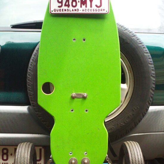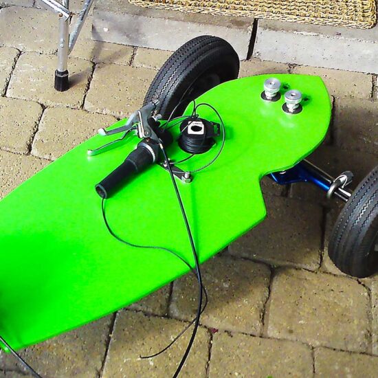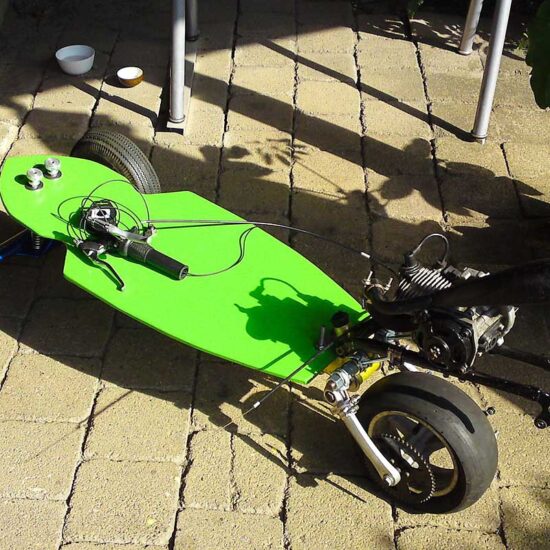 This little green beastie started off when Tim came across what was left of a small motorbike (a pit bike for those in the know). The two stroke CAG engine seemed fine by appearances, and after some tinkering started up fine. The frame from the motorbike was ditched, and a Mongoose mountain bike frame was donated for the cause. After an over-sized alloy truck (the front axle) was ordered, Tim had the beginnings of a powered mountain board.