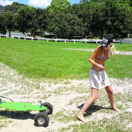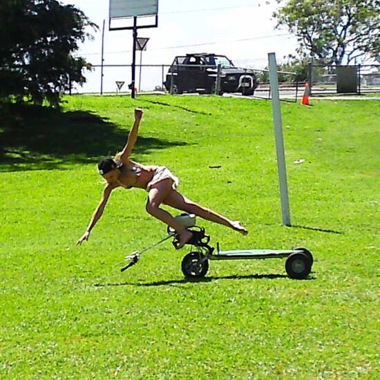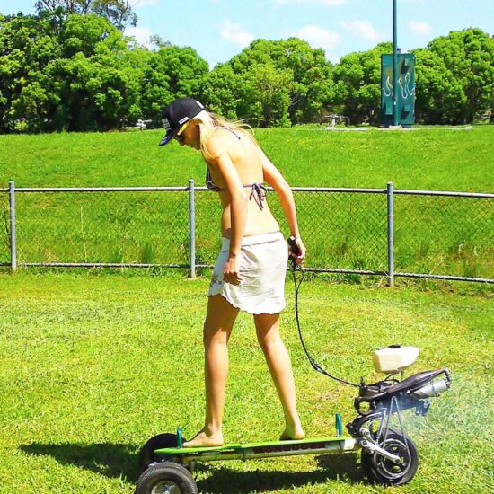 During the second testing session on a field (with the girl in the photos), I let go of the throttle lever abruptly at full speed. Even though the remote hand controller also had a brake lever, simply letting go of the throttle was enough to slow the board down quickly in the grass. Quickly enough, in fact, for me to go flying over the front of it, landing on my shoulder and breaking my collar bone.
